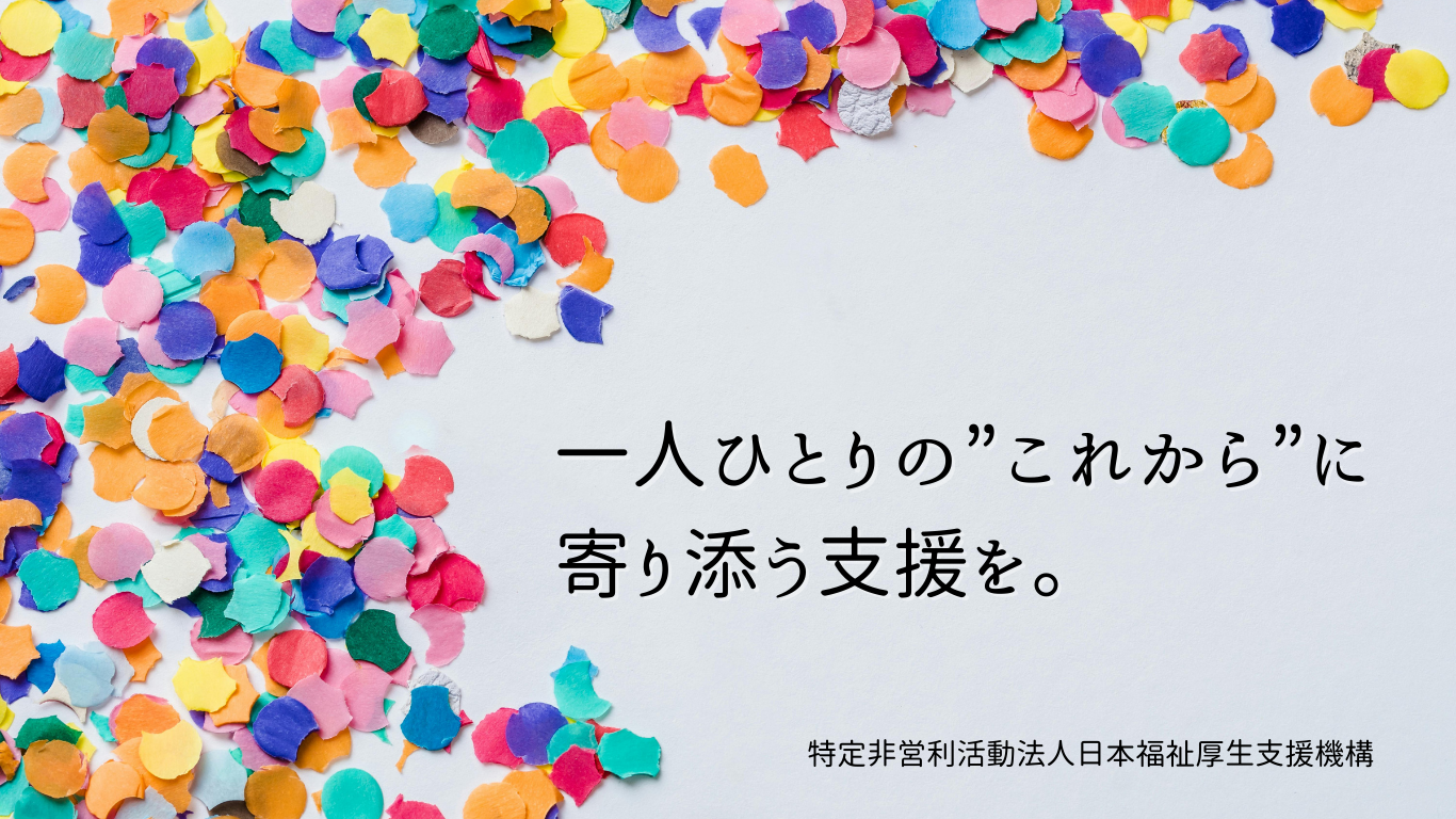 特定非営利活動法人 日本福祉厚生支援機構は、福祉的支援を必要とする方や、社会復帰を目指す方に寄り添い、地域で安心して暮らし続けられる環境づくりを目指して活動しています。